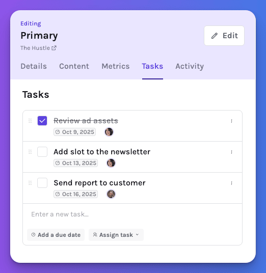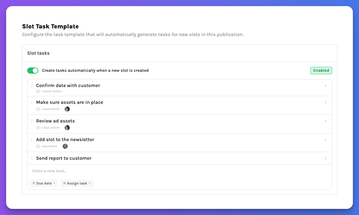 Build a template once — for a specific publication or campaign type — and Sponsy will automatically add your predefined tasks every time a new slot or deal is created.