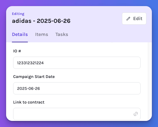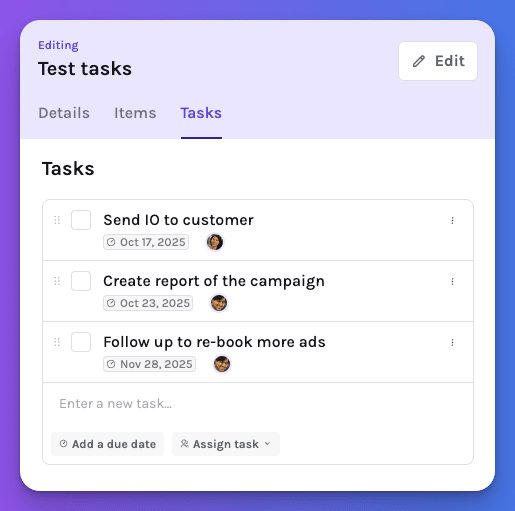 For bigger campaigns, you can also create tasks at the Deal level. Keep track of high-level steps across multiple placements — like final approvals, reporting, or invoicing.