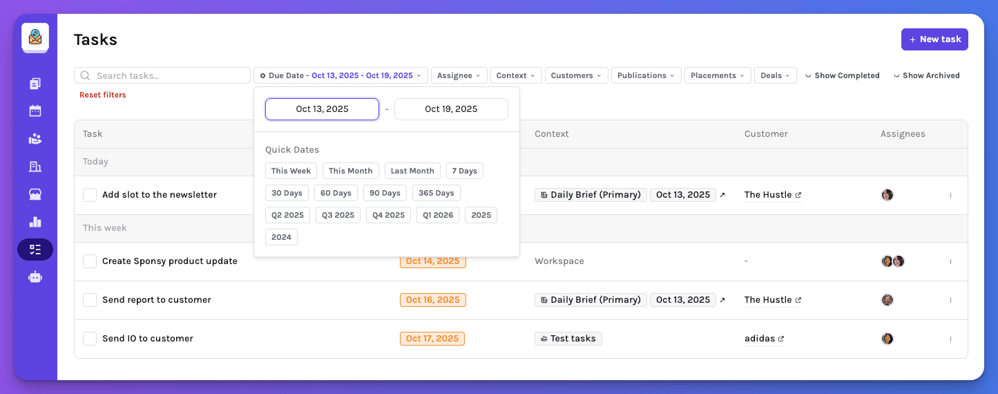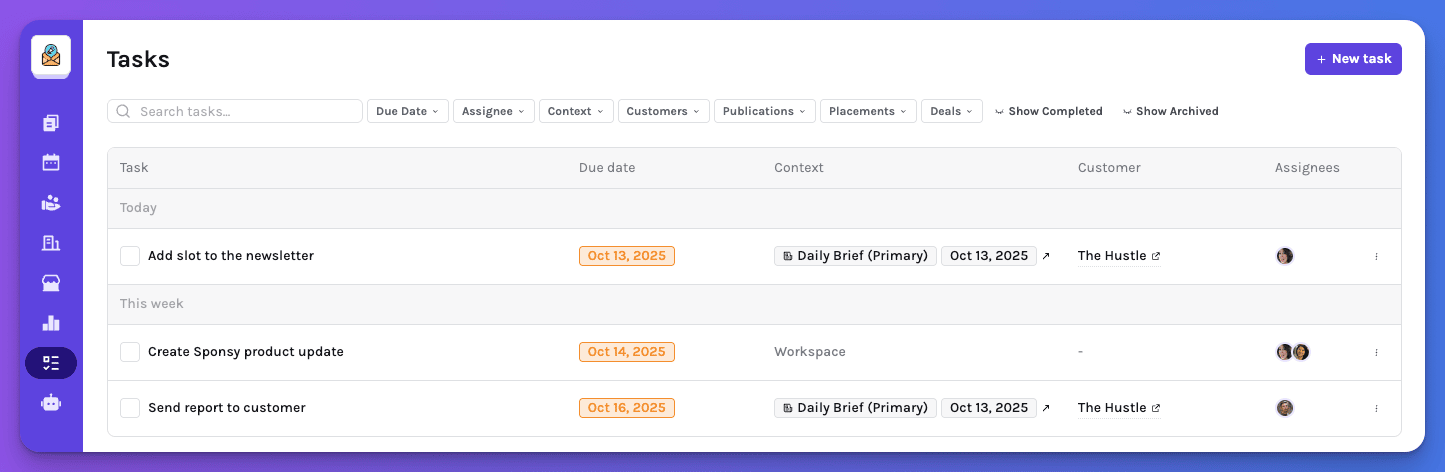 Want the big picture? Head to the new Tasks page to view every open task across your team. You can filter by assignee or due date to see exactly what’s on your plate.