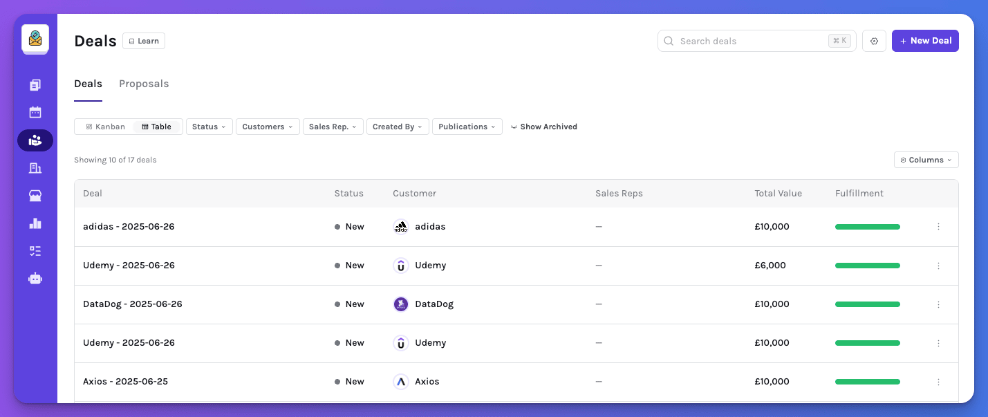 Tired of clicking into every deal just to get a status update? The new Table View gives you a high-level, condensed overview of all your deals — with your custom fields visible as columns.